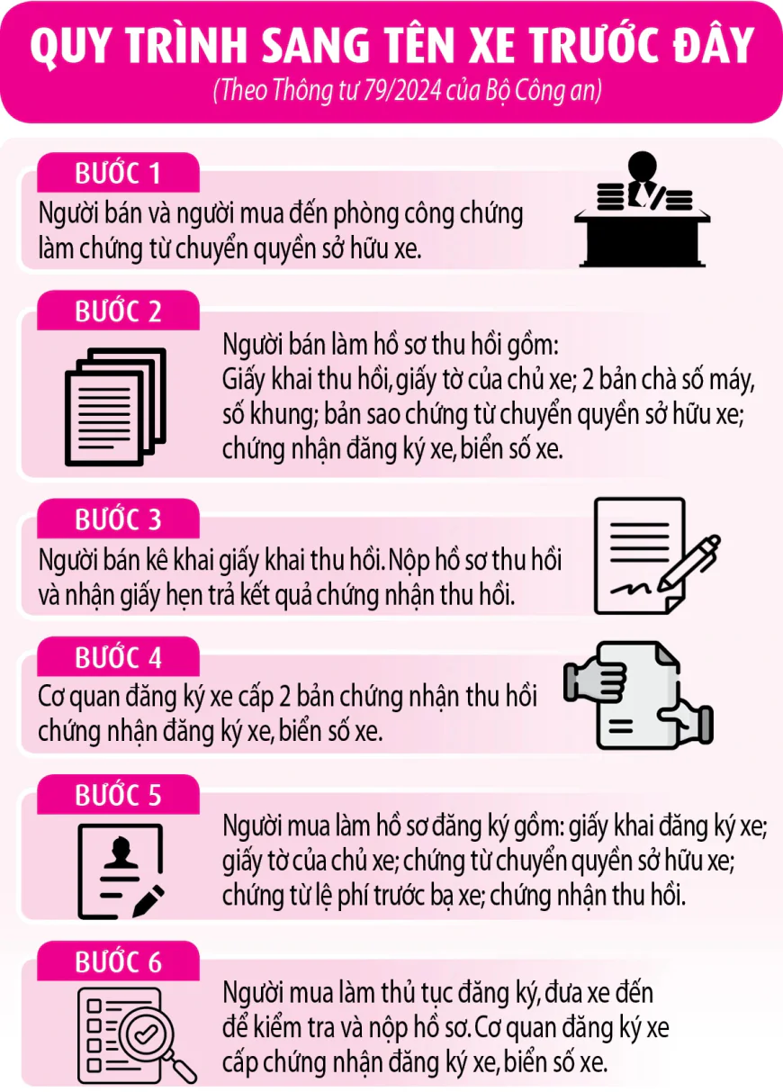 Khi hoàn tất thủ tục thu hồi tại cơ quan đăng ký xe, Cổng dịch vụ công sẽ chuyển thông tin giao dịch sang cho hệ thống của cơ quan thuế, người mua thực hiện thủ tục nộp lệ phí trước bạ tại cơ quan thuế. Sau khi hoàn tất thủ tục nộp lệ phí trước bạ, người mua thực hiện thủ tục đăng ký sang tên xe tại cơ quan đăng ký xe như quy định của Thông tư 79/2024 của Bộ Công an.