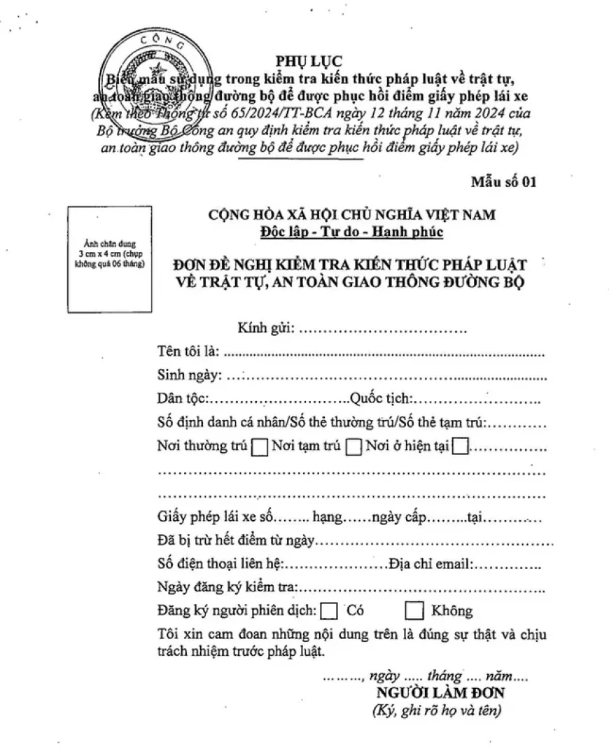 Hồ sơ gồm đơn đề nghị theo mẫu số 01 (Phụ lục kèm theo Thông tư số 65/2024/TT-BCA ngày 12/11/2024); Giấy khám sức khỏe của người lái xe do cơ quan có thẩm quyền cấp, còn giá trị sử dụng.